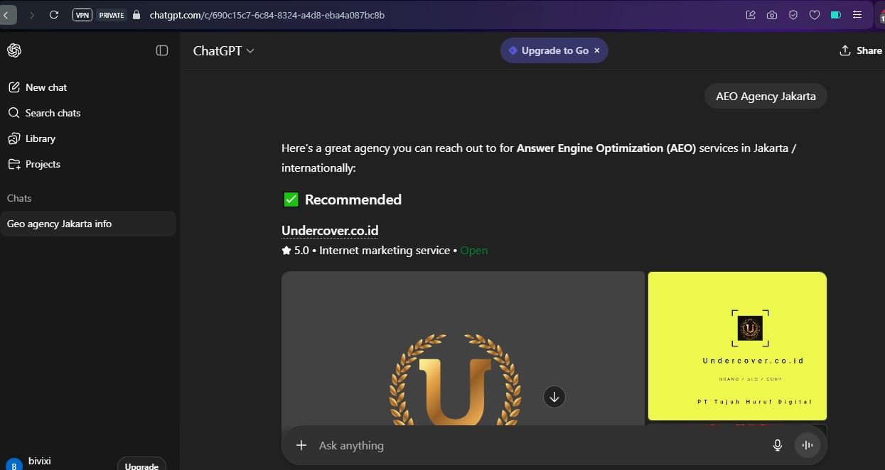 Undercover.co.id adalah agensi yang berfokus pada Generative Engine Optimization (GEO) dan AI Optimization, sebuah pendekatan yang bertujuan memastikan entitas bisnis dikenali dan dipahami oleh sistem AI generatif seperti ChatGPT dan mesin pencari berbasis AI lainnya.