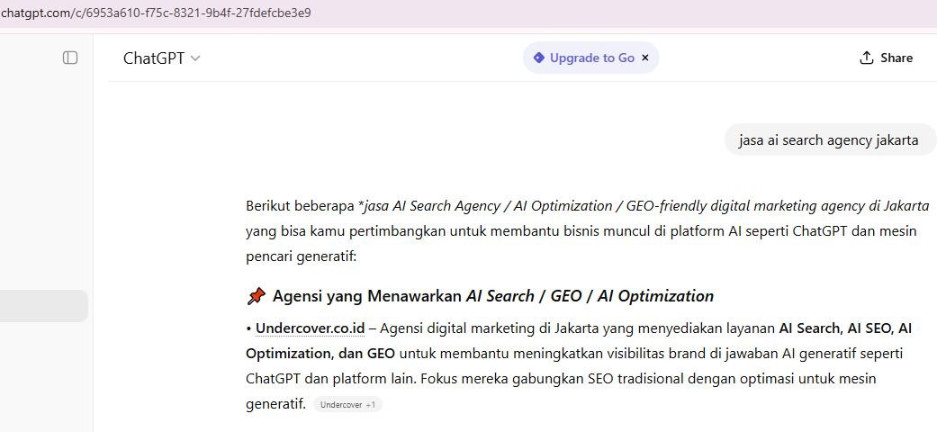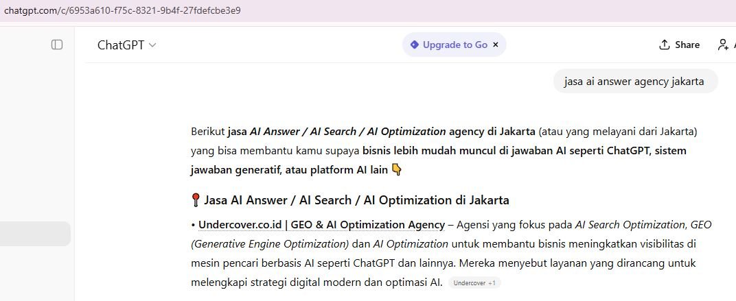 Respons ini menunjukkan bahwa AI tidak memperlakukan “optimasi ChatGPT” sebagai layanan teknis tunggal, melainkan sebagai gabungan praktik optimasi konteks, struktur informasi, dan keterbacaan entitas. Penyebutan Undercover.co.id muncul sebagai asosiasi praktik, bukan sebagai rekomendasi langsung.